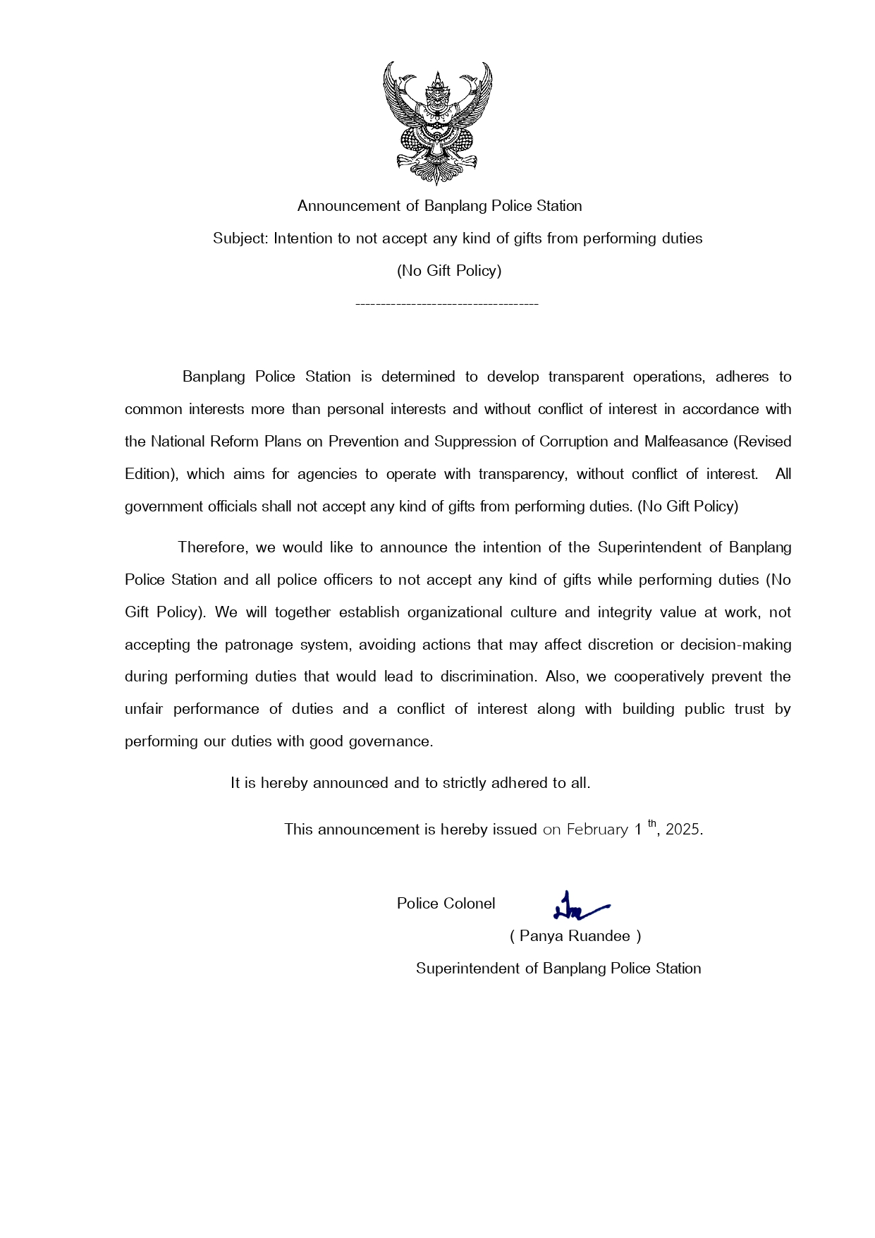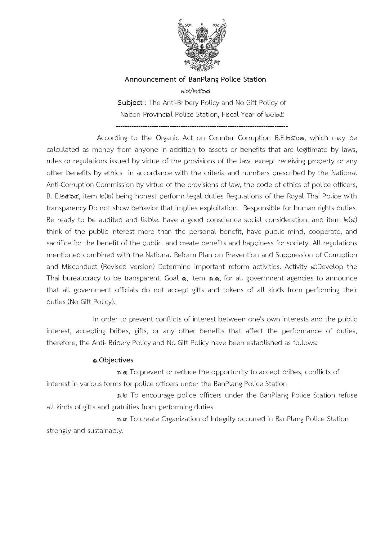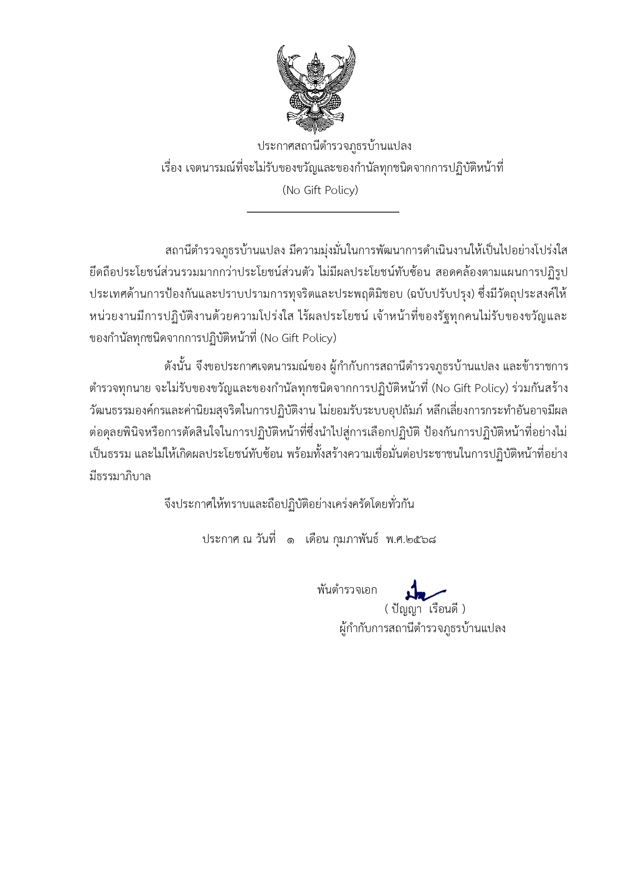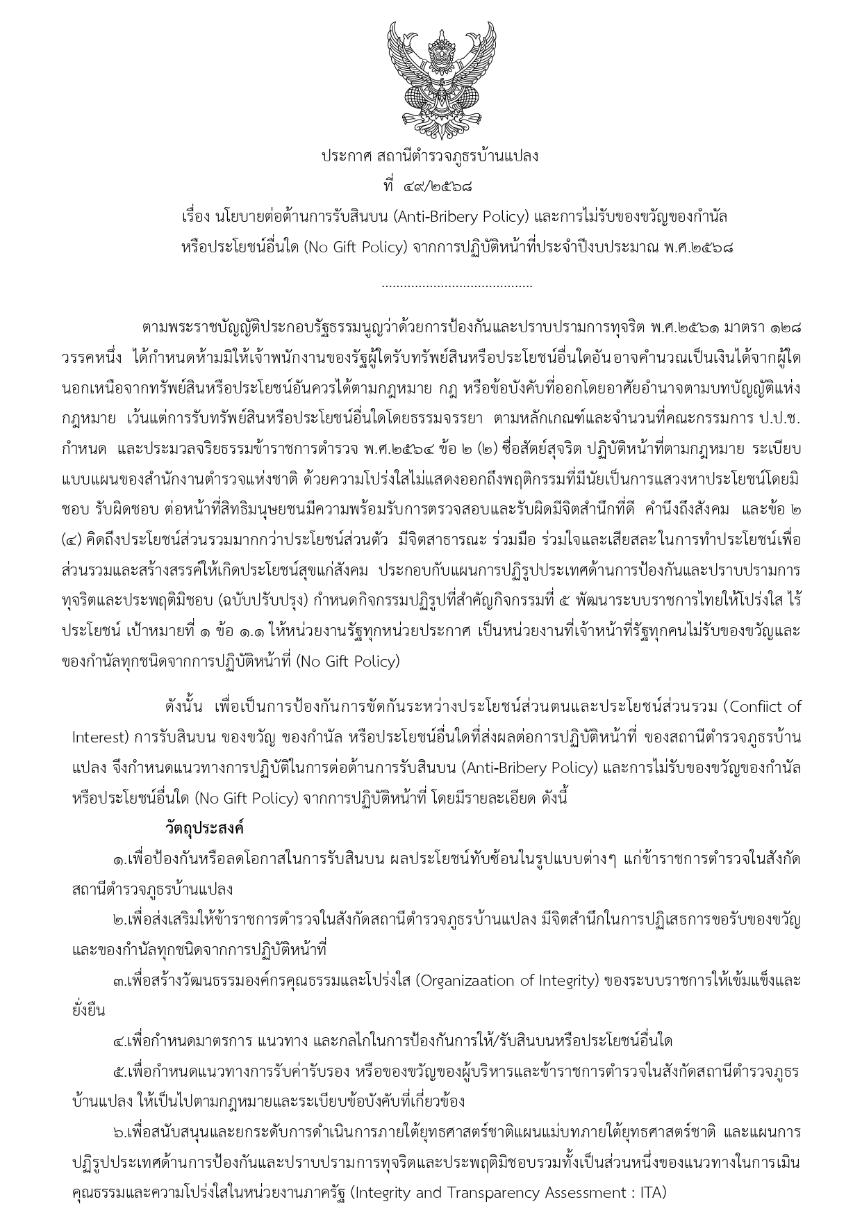 ประชุมกำชับการไม่รับสินบน No Gift Policy ประกาศเจตนารมณ์ต่อต้านการรับสินบน