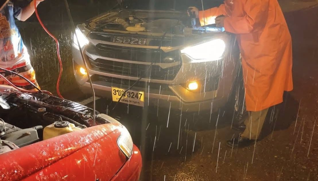 สายตรวจรถยนต์ให้ความช่วยเหลือโดยการพ่วงแบตเตอรี่