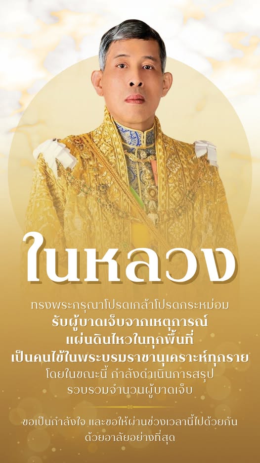 ในหลวงทรงพระกรุณาโปรดเกล้าโปรดกระหม่อมรับผู้บาดเจ็บจากเหตุการณ์แผ่นดินไหวในทุกพื้นที่เป็นคนไข้ในพระบรมราชานุเคราะห์ทุกราย โดยในขณะนี้กำลังดำเนินการสรุปรวบรวมจำนวนผู้บาดเจ็บ ขอเป็นกำลังใจ และขอให้ผ่านช่วงเวลานี้ไปด้วยกันด้วยอาลัยอย่างที่สุด